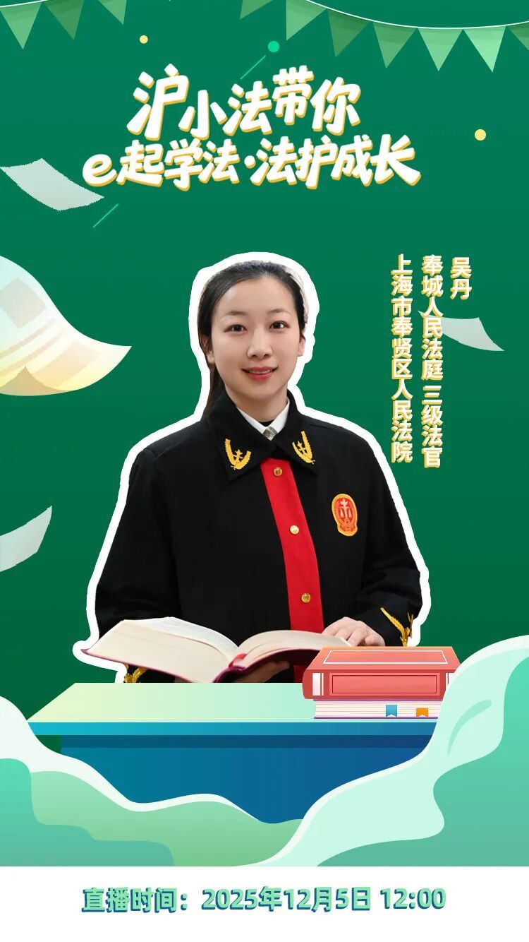 2025年12月5日12:00,由上海市高级人民法院主办,上海市奉贤区人民法院、上海市头桥中学承办的《沪小法带你e起学法·法护成长》直播普法课即将开播!