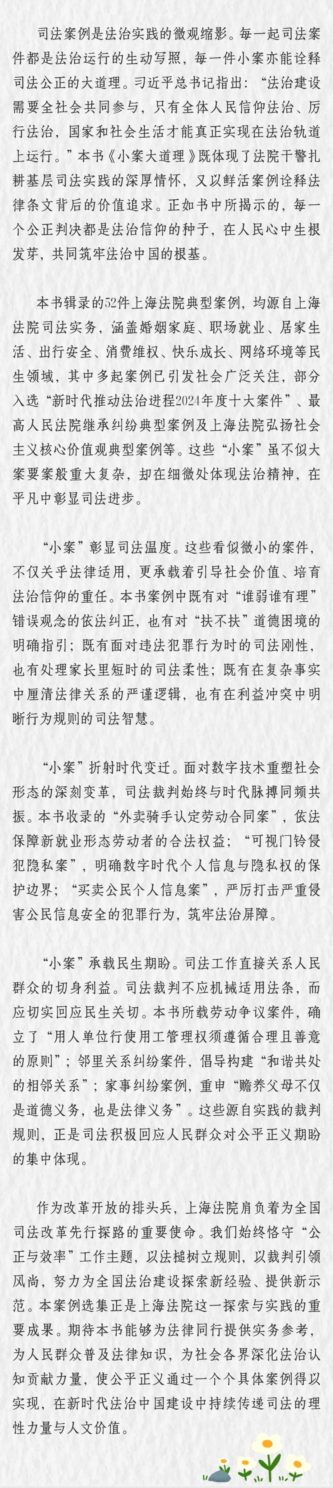 看到上海高院将“小案大道理”栏目内容结集成书,我深感欣喜。这些来自审判一线的案例,生动诠释了人民法院“勿以案小而不为”的司法担当。它们凝聚着广大法官在每年近百万件纠纷中的坚守努力,也让我们看到,公平正义正是在这些与民众息息相关的“小案”中落地生根。
