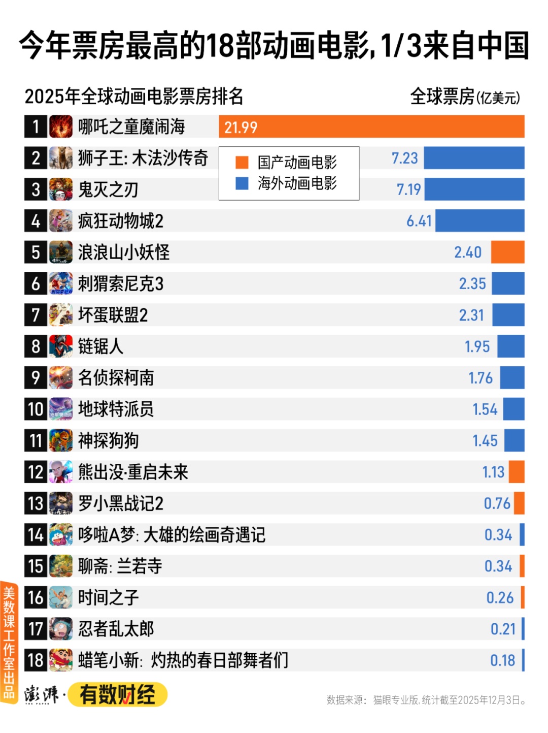 据澎湃美数课报道,今年全球票房最高的18部动画电影中,国产动画电影就有6部。《报告》发现,过去半年,有近半数观众提到“支持国产动画”是其走进影院的重要动因之一。