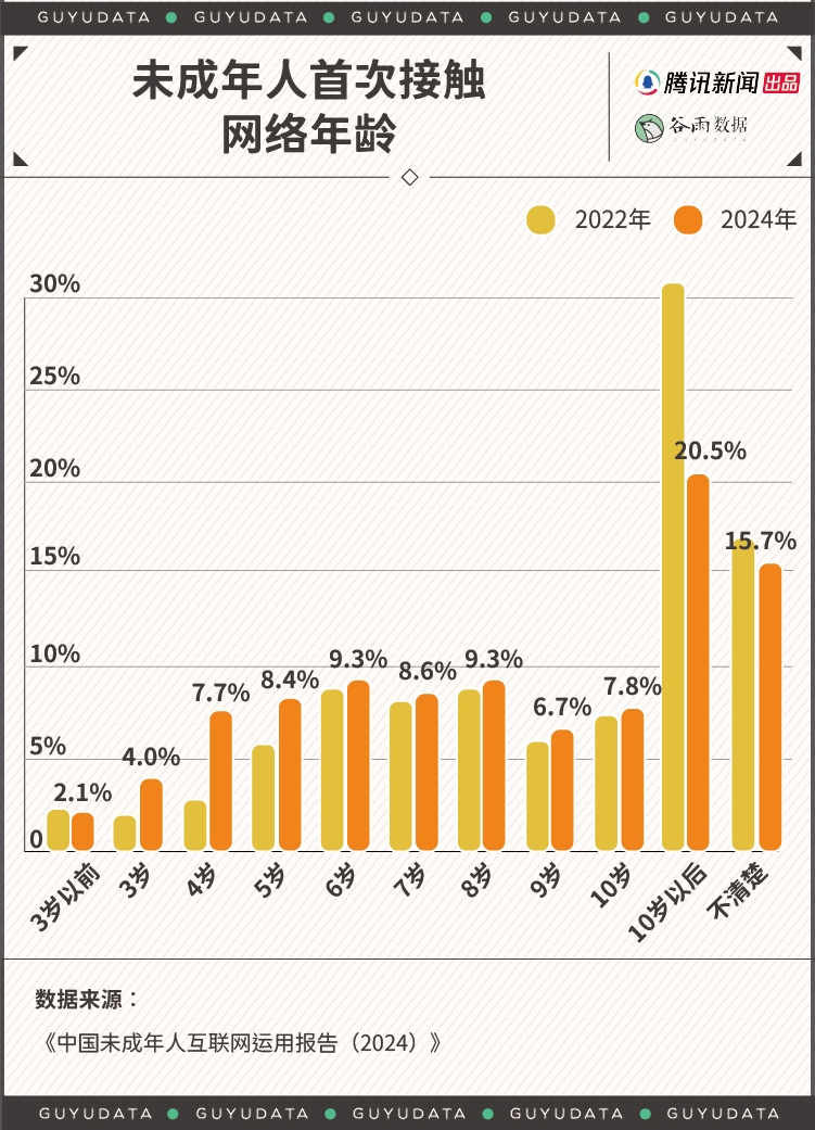 据谷雨数据报道,目前全国未成年网民数量已接近2亿,触网低龄化趋势愈发显著。《中国未成年人互联网运用报告(2024)》显示,2024年,超六成孩子在10岁以前就开始接触网络。