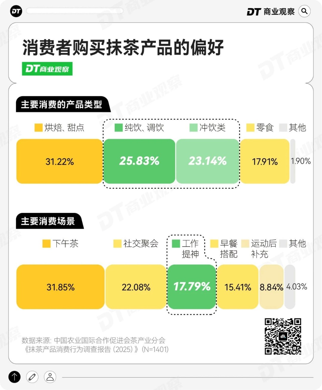 今年9月发布的《抹茶产品消费行为调查报告(2025)》显示,有25.83%的消费者主要会购买抹茶纯饮、调饮,还有23.14%的消费者主要购买抹茶冲饮。人们消费抹茶产品的主要场景,除了休闲的下午茶(31.85%)和社交聚会(22.08%),就是工作提神(17.79%)。