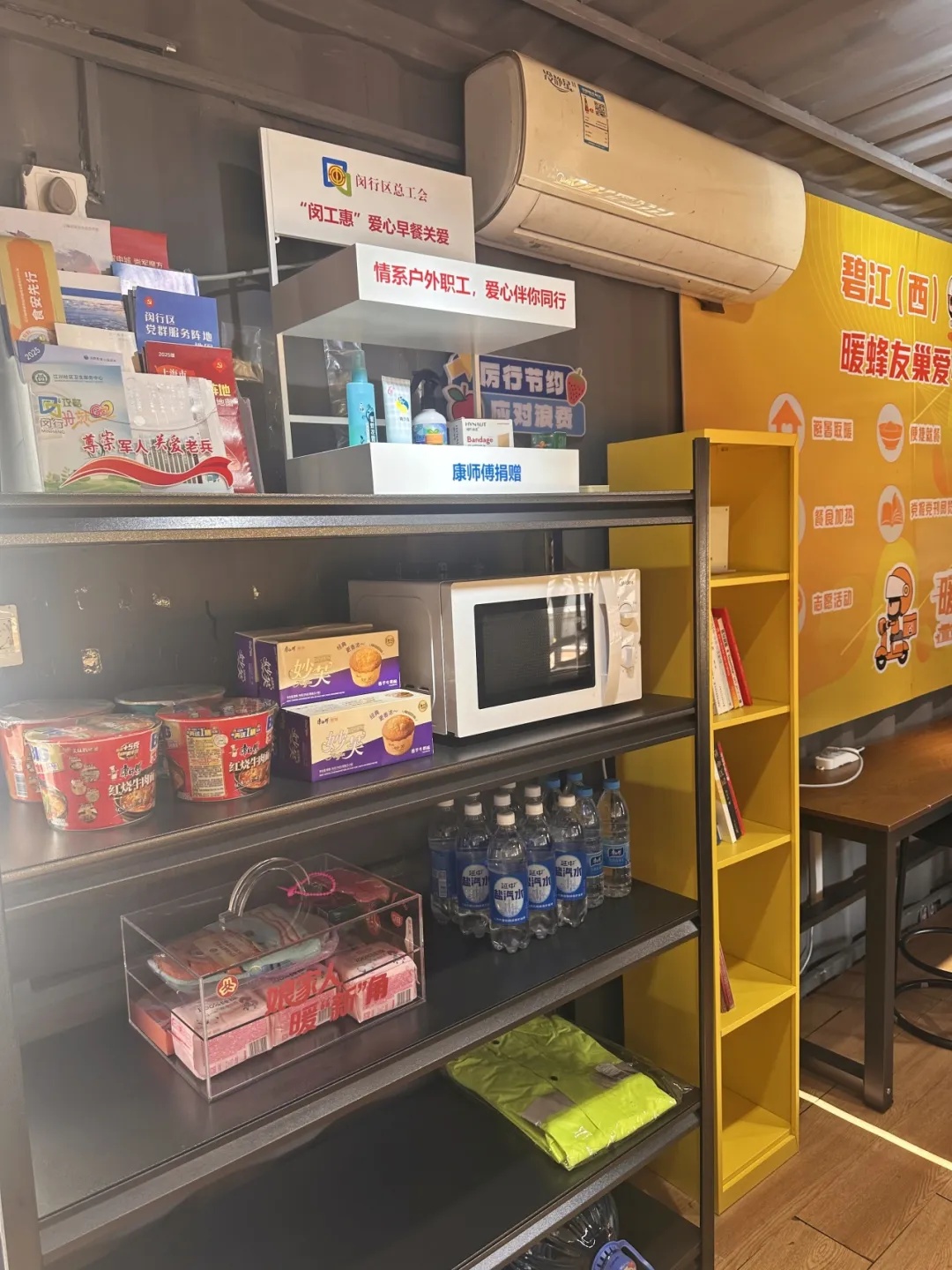 暖蜂友巢爱心站内常备饮用水、应急雨披等基础物资。季节更替时,防暑降温的藿香正气水、清凉油,冬季的暖手宝、热饮等也会及时上线,贴心守护每一位户外劳动者。