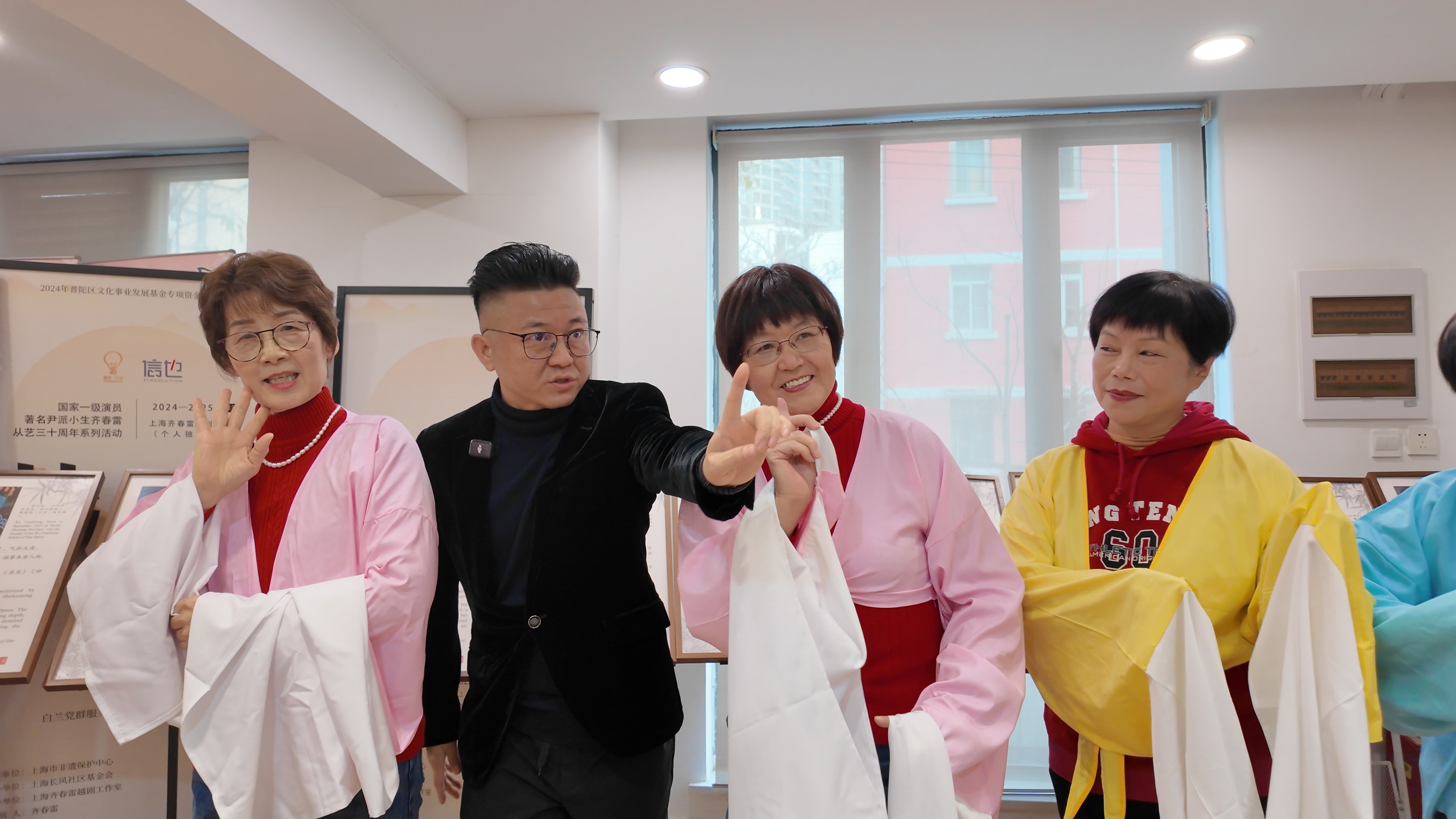 展览现场,齐春雷耐心解答戏迷们关于唱腔特点、表演技巧的疑问,还亲身示范,从身段到手眼,悉心指导着每一位爱好者,让社区的越剧爱好者们过了一把“戏瘾”。