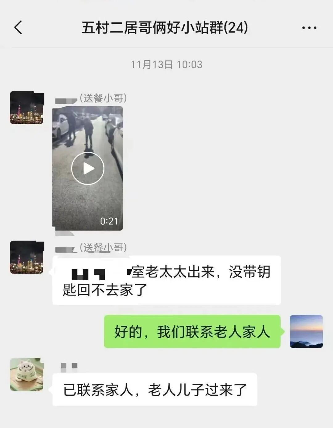 不久前,一名送餐小哥在前往淞南新五村某老人家中送餐时,发现一位失智老人独自在小区内徘徊、无法用言语表达住址。他立即通过“哥俩好”微信群向居委报告,居委随即联系上家属。小哥耐心安抚老人、陪同等待,直到家属赶来并安全护送老人回家。这件暖心事在社区传开后,带动更多新就业群体主动加入社区服务队伍。