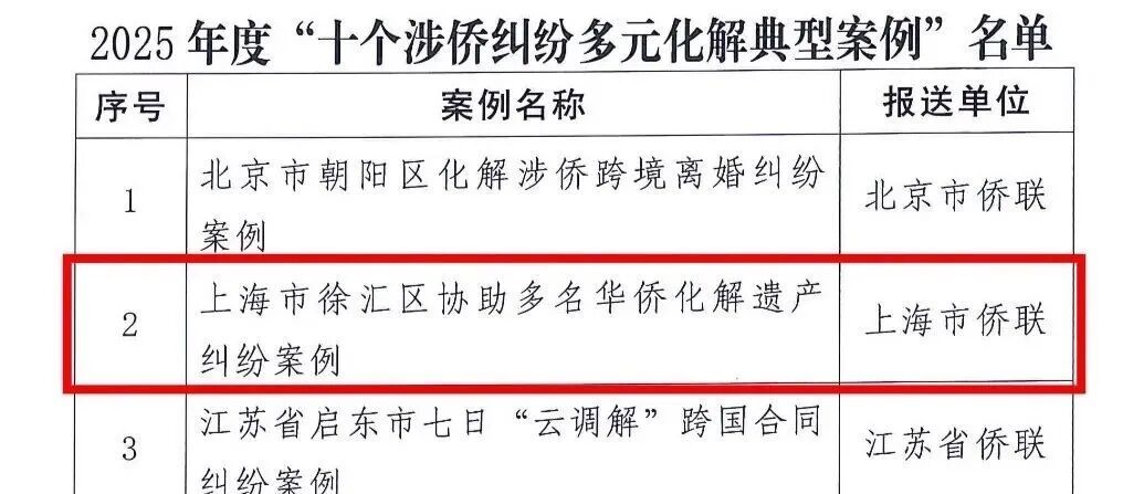徐汇区侨联案例入选中国侨联2025年度“十个涉侨纠纷多元化解典型案例”