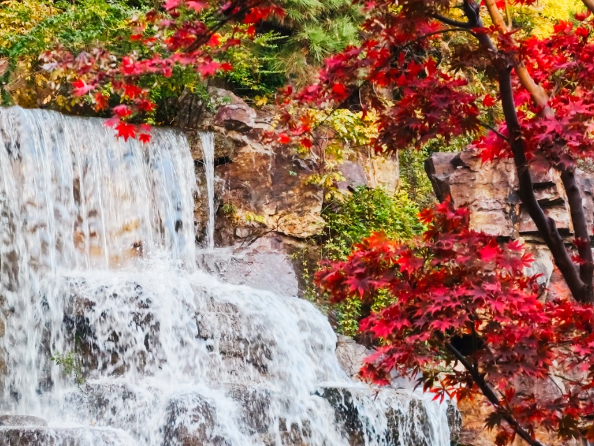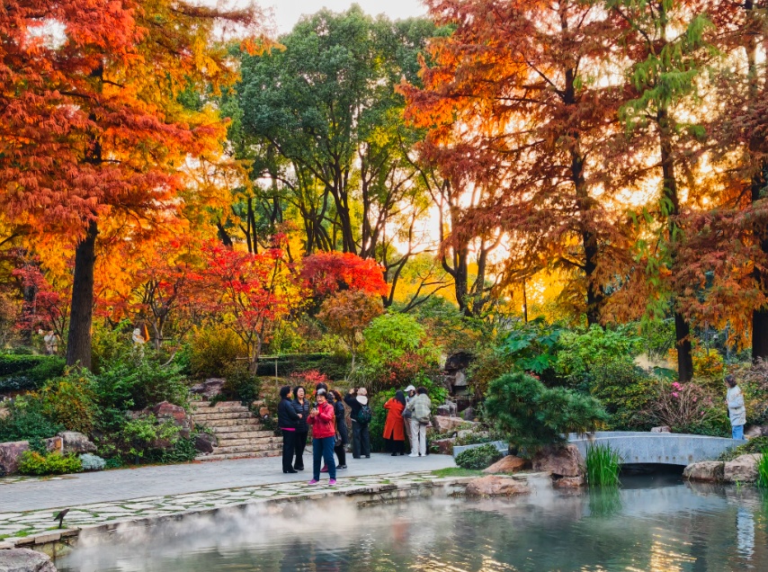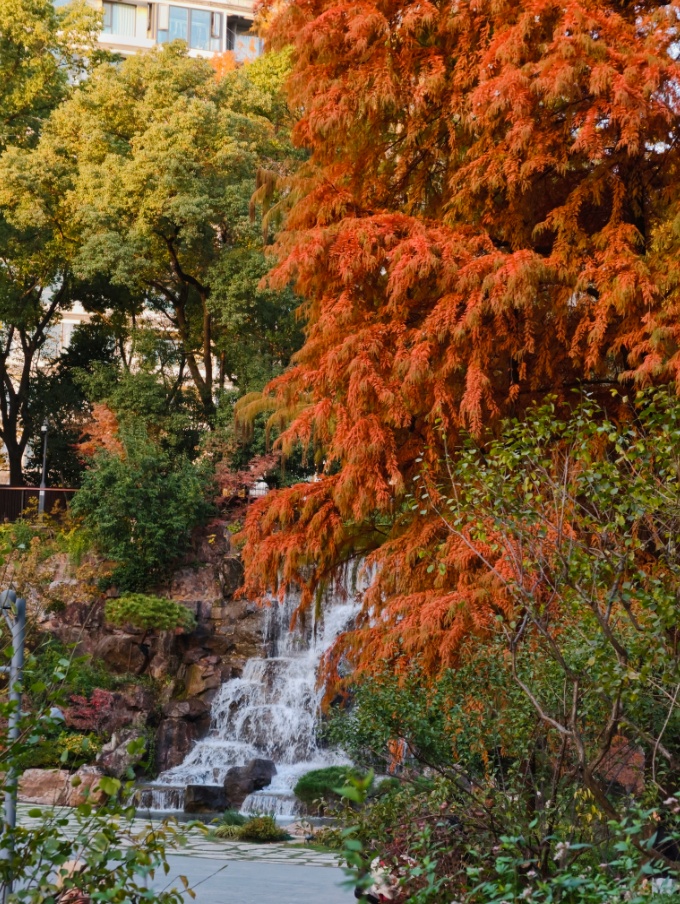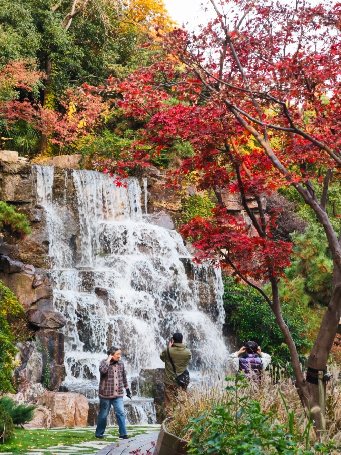 假山叠瀑处,仍是园内最具人气的所在。水流潺潺,林间氤氲起水雾,让周围的色彩愈发润泽通透。水声与光影交织,为这幅静态的秋日油画,注入了声音与流动的灵魂。