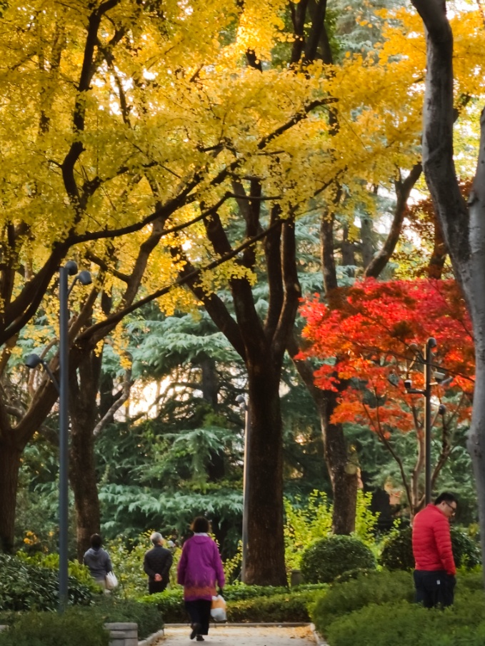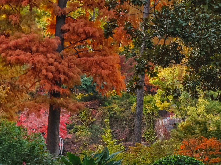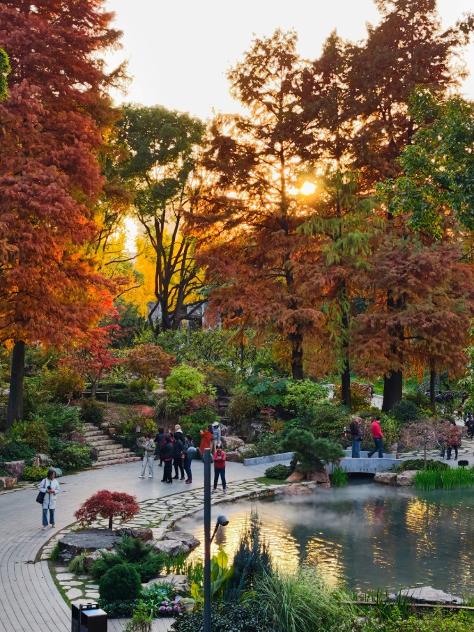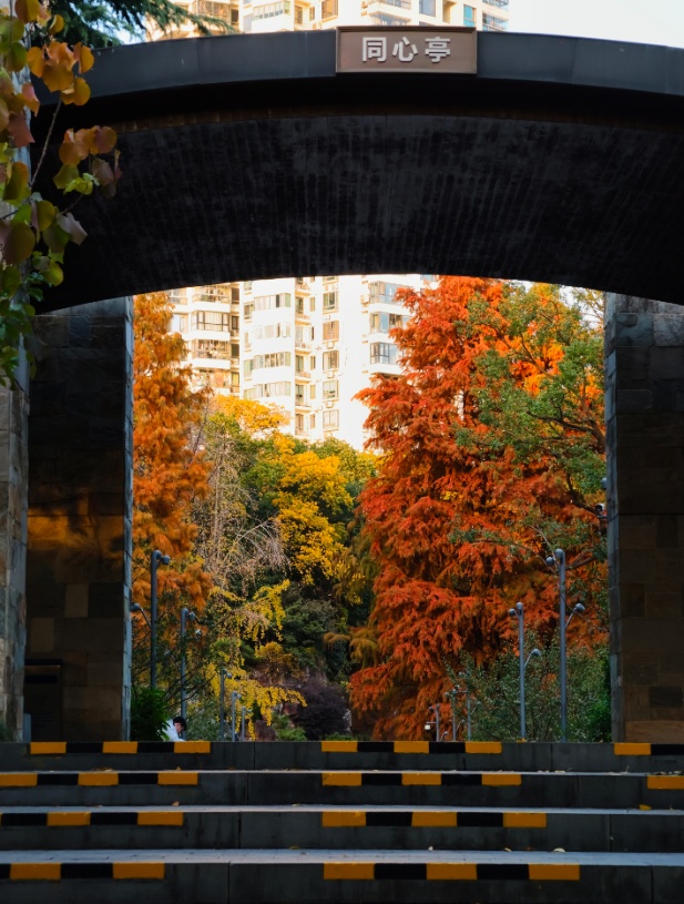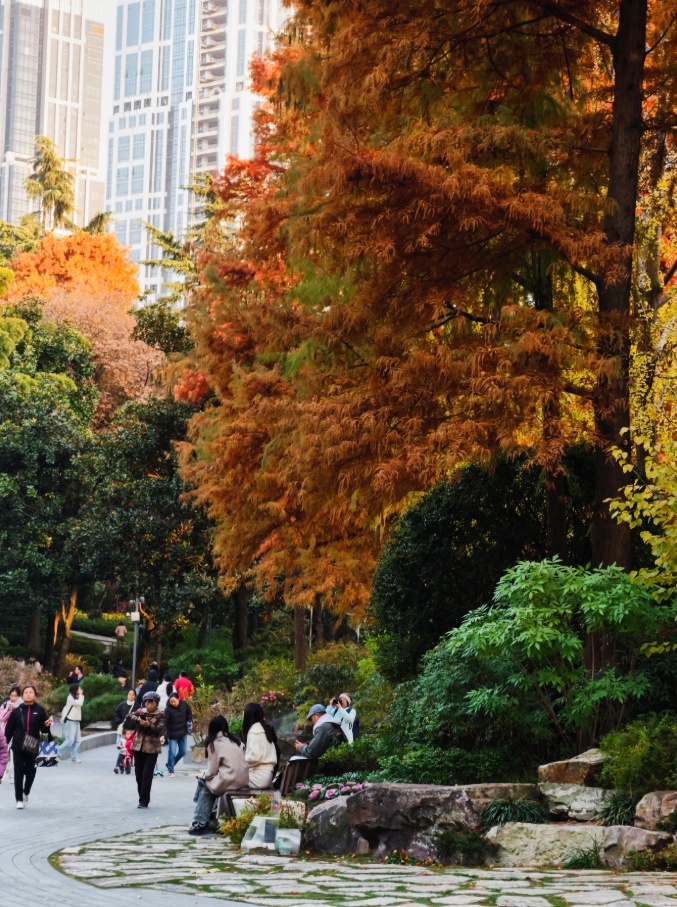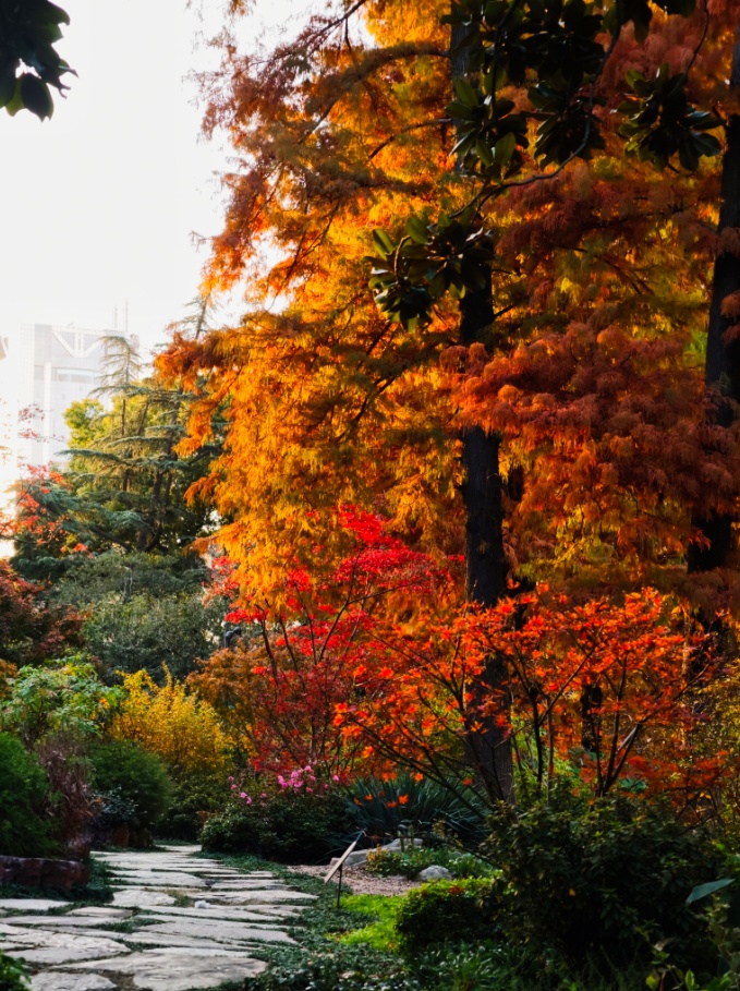 银杏洒下落日熔金般的灿黄,红枫点燃一簇簇火焰,落羽杉披上渐变的焦糖色外衣,与常绿树木的苍翠交织、叠加。