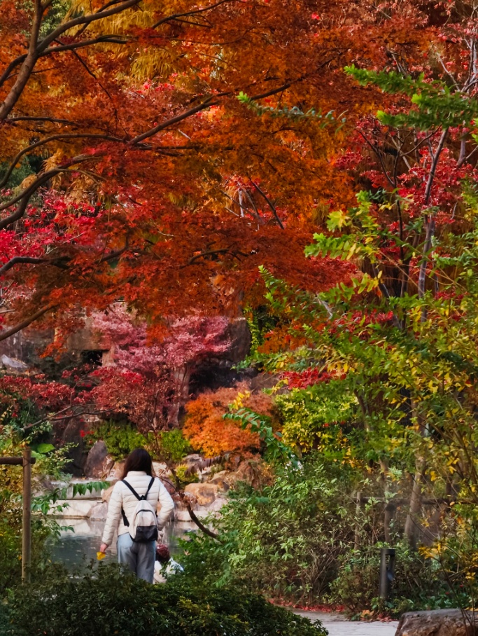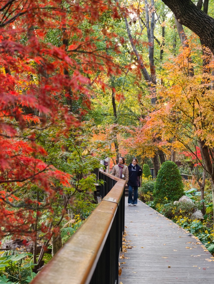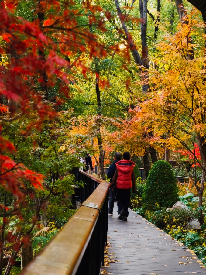 身侧景致随步伐移换,时而遇见一树灼目的红,时而俯瞰园中斑斓树冠和水景。