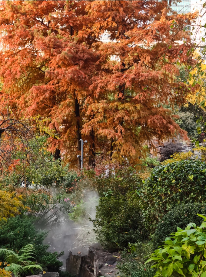 自2023年完成升级改造后,延安中路老成都北路西北角、比邻中共二大会址纪念馆的辅德里公园,就成为许多人心中“偷得浮生半日闲”的宝藏去处。去年冬日,它因水雾缭绕、层林尽染被许多网友感慨美如“秘境山谷”;今年此时,这幅自然“画卷”又到了笔触热烈的时节。