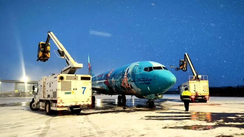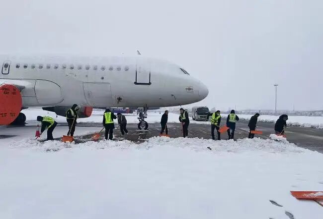 一部分伙伴挥舞着除雪工具,一点点扫清地面积雪,为飞机拖车开辟出安全通道;另一部分则配合机务人员,先用刮雪板小心翼翼刮去机翼上的积雪,再用除冰车缓缓喷洒除冰液,将残留的冰霜彻底消融。