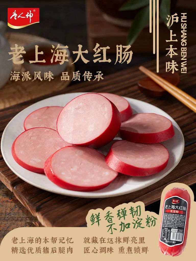 “老上海大红肠” (上海唐人神肉制品有限公司):上海唐人神肉制品有限公司代表产品,鲜香味美、肉香醇厚。产品秉承传统工艺,历经腌制、斩拌、灌肠、熏煮等多道工序匠心制作,精选品质好肉,不添加淀粉,延续经典风味。
