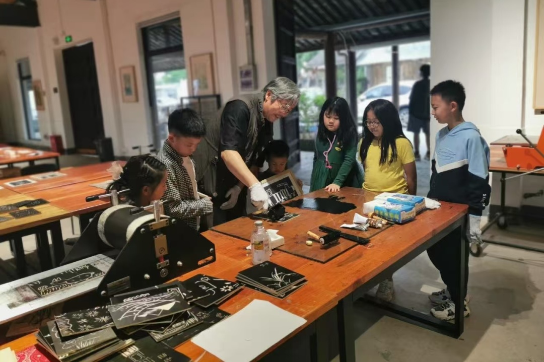 金山版画:作为金山区级非遗项目,是一门古老而又精湛的艺术形式,版画融合木刻、石版、铜版等多元工艺,通过刻、雕、蚀手法将艺术转化为独特印记。无论是细腻木刻的刀锋纹理,还是铜版蚀刻的光影交织,皆可在版画上一一体现。