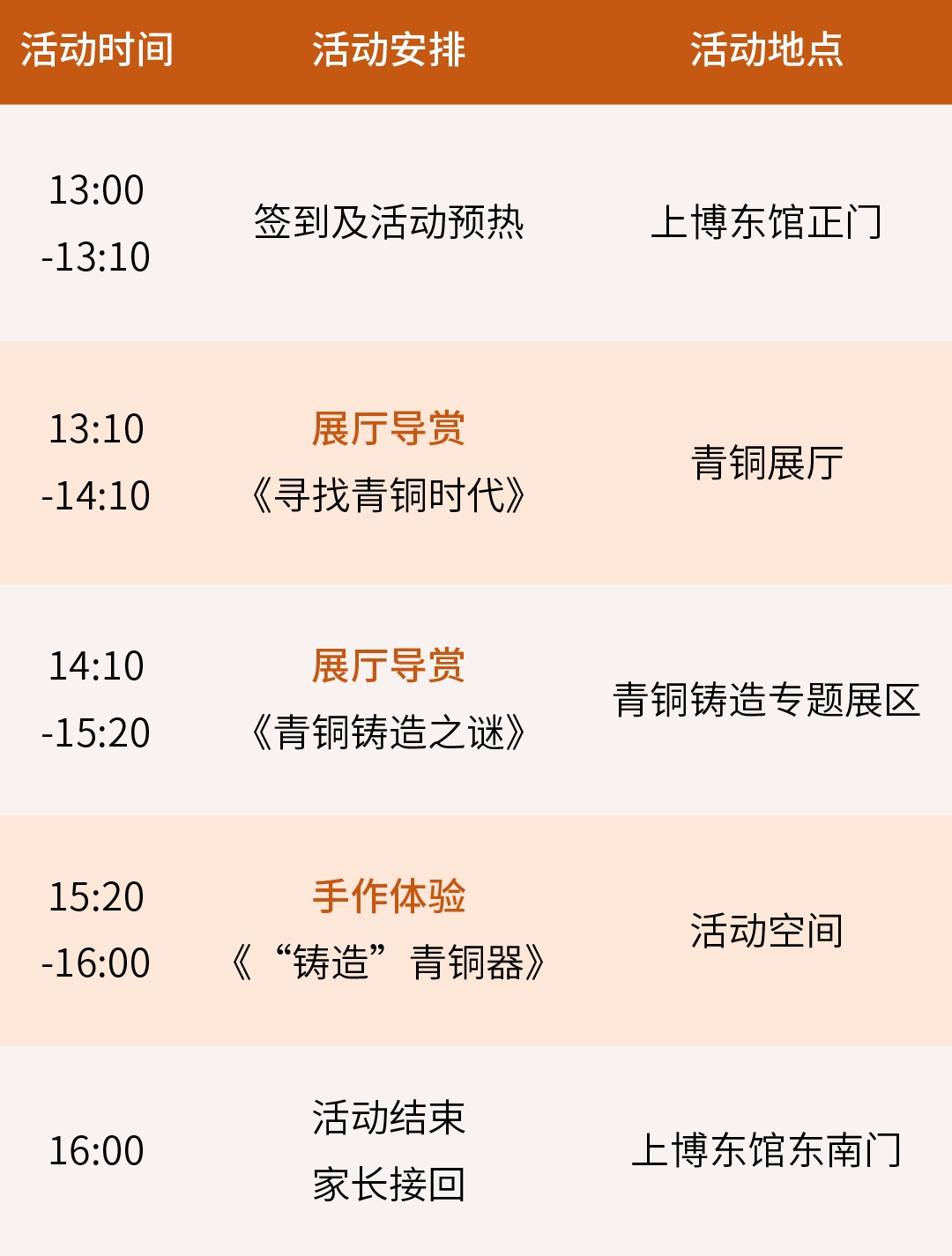 《中华小铜匠》半日营活动,将带领6-12岁的青少年一起走进上海博物馆青铜馆与中国古代“青铜器制作技术”专题陈列版块,从技术的角度去审视一件件精美的青铜器、从生产的维度去了解一件青铜器的前世今生、从文明的高度去感悟中国青铜文明的独特魅力,并体验“铸造”一件独属于自己的仿青铜器。