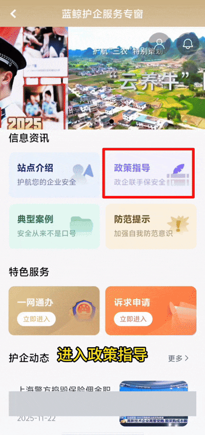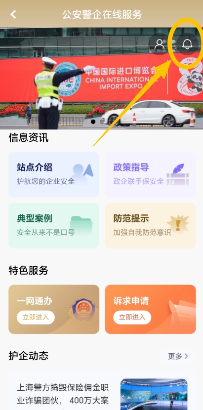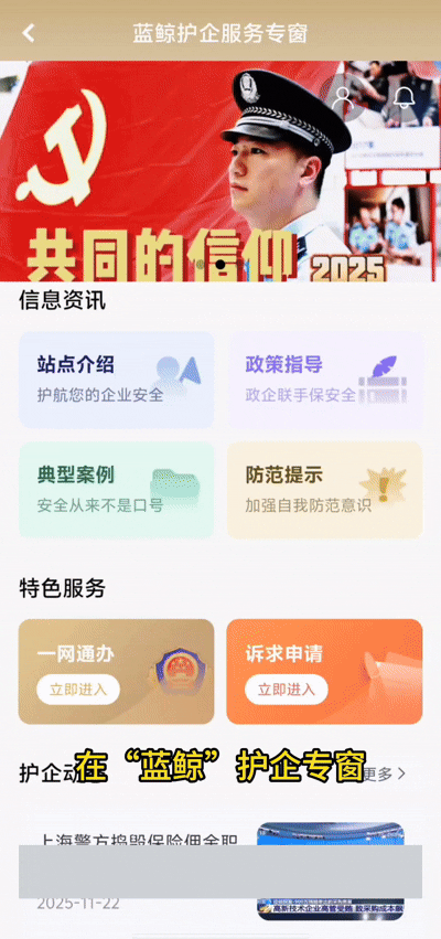 在“随申办企业云”首页点击 “公安警企在线服务”,或通过首页搜索框 “大家都在搜” 热词“蓝鲸” 进入护企专窗,支持查看消息提醒、信息资讯、护企动态及进行诉求申请操作。