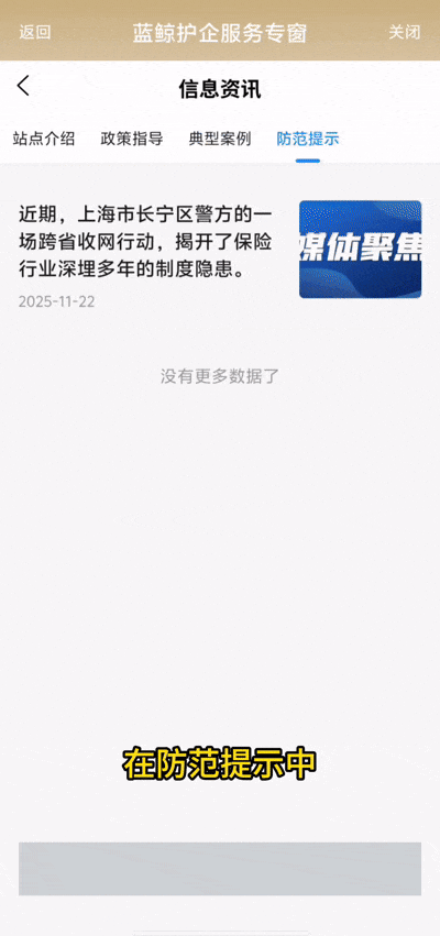“信息资讯”板块展示站点介绍、政策指导、典型案例及防范提示4个方面资讯信息。点击对应标签可进入详细资讯页面。