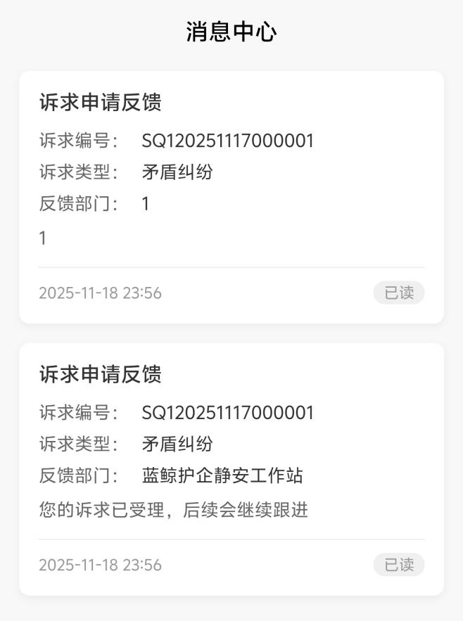 点击专窗右上角按钮,进入“消息中心”页面,该页面展示最新消息列表,点击对应标签,进入消息详情页面,如下图所示。