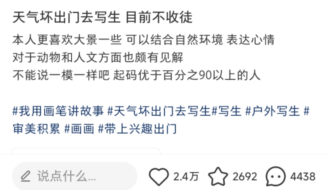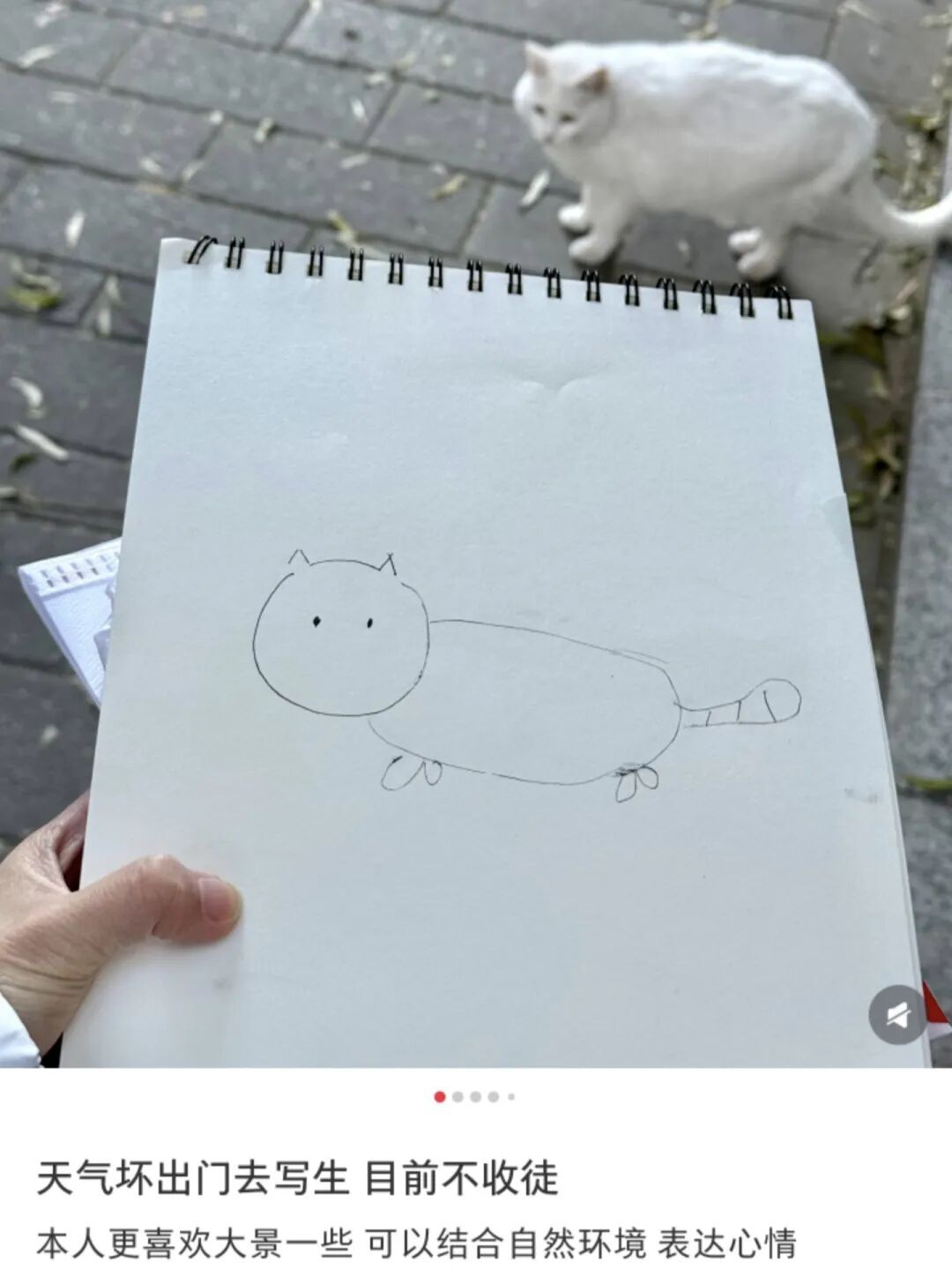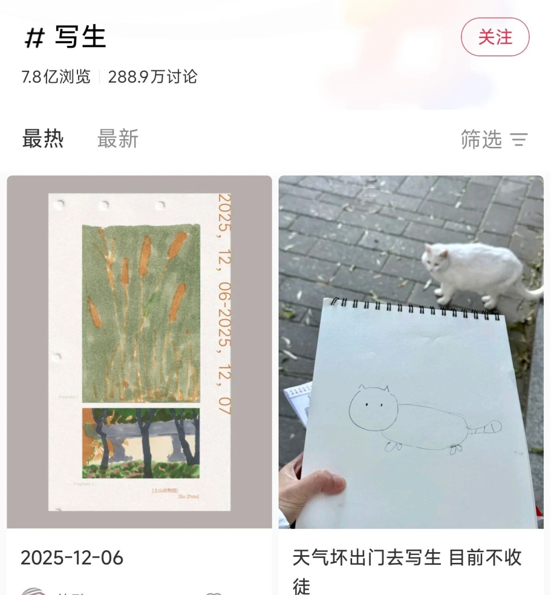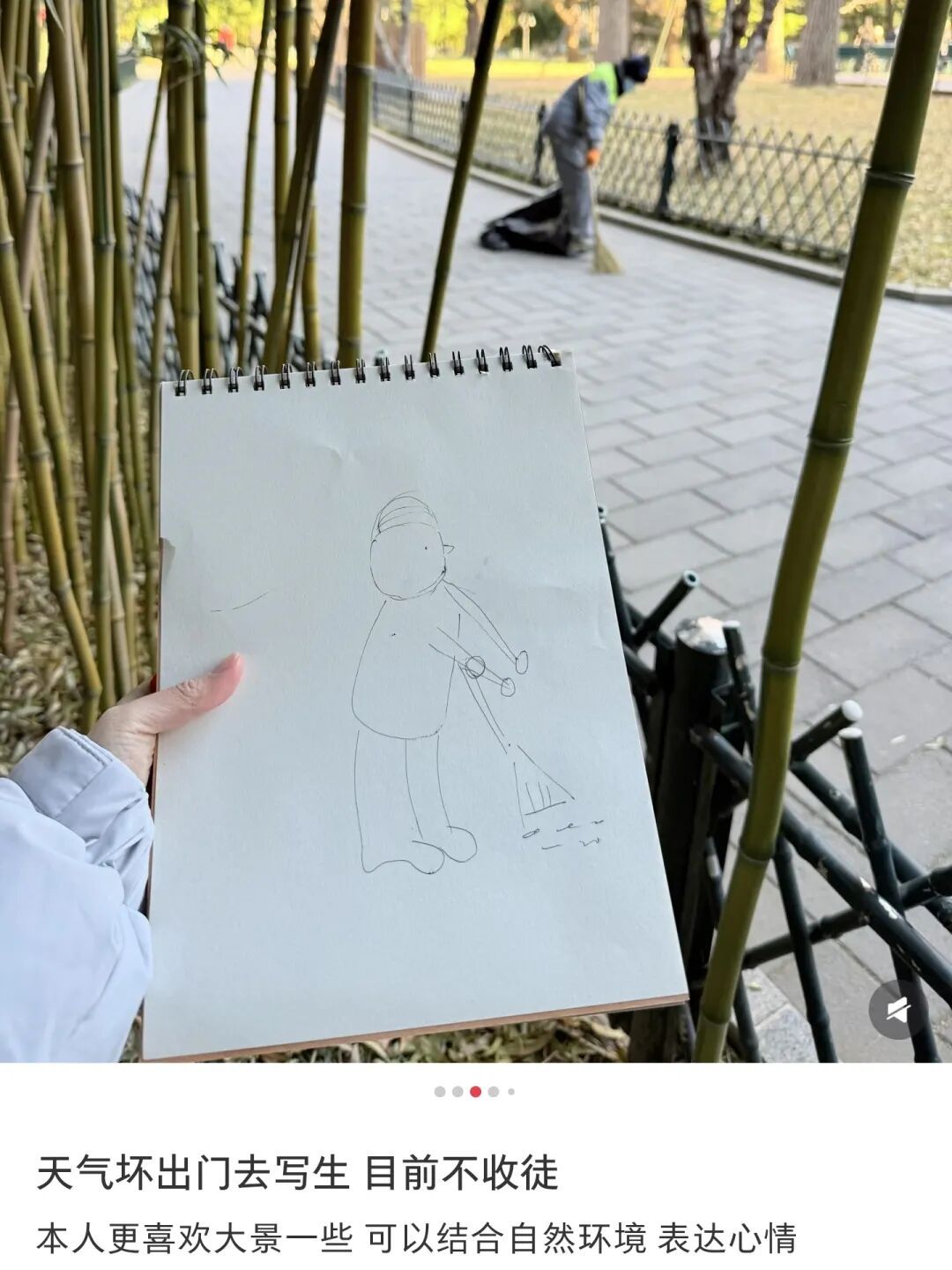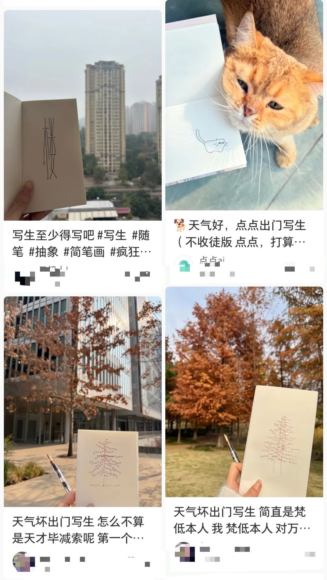 在小红书上,该话题有着7.8亿浏览量。往下翻一翻,“天气好,出门写生”“目前暂不收徒”成了众多分享帖共用的口头禅。他们画人,画猫画狗画动物,还画花画树木画植物,也画画窗户、门、垃圾桶等静物,总之,主打一个看见什么画什么。