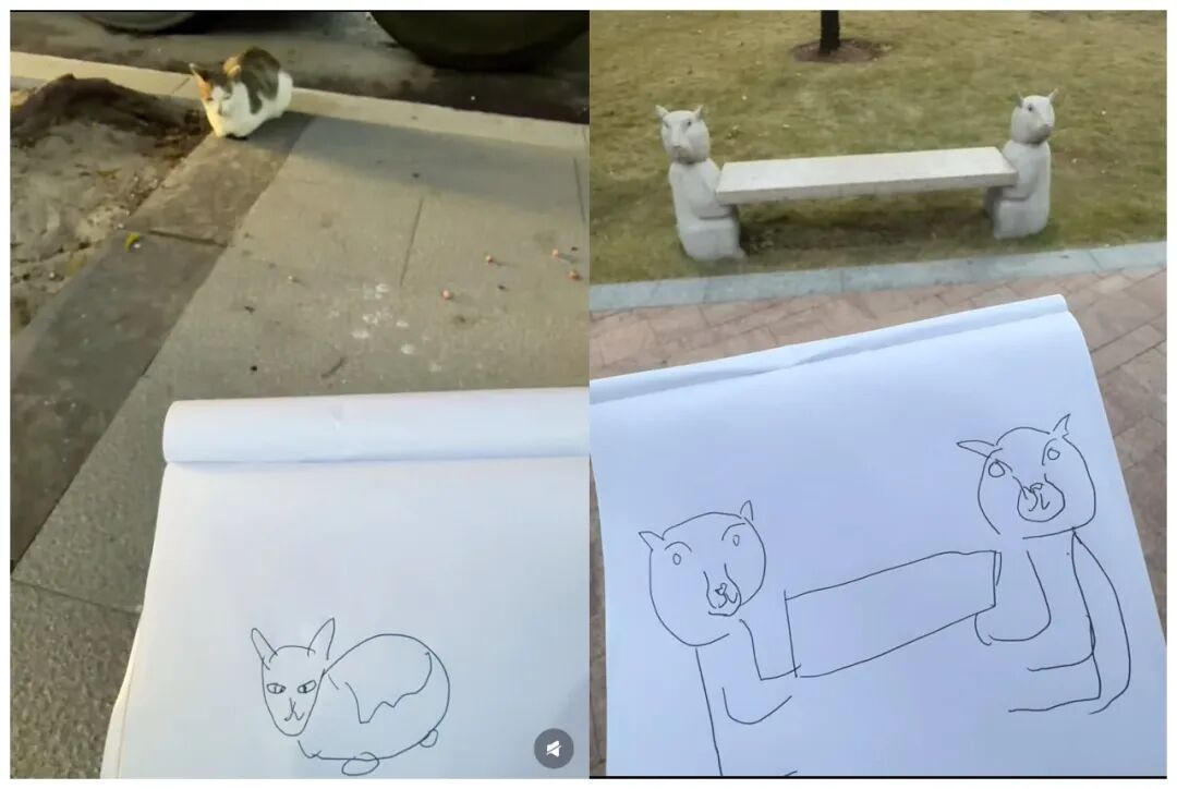 她曾在公园里看到亲子间的有爱互动,产生了强烈的记录冲动。还有一次,她在喂流浪猫,想把猫咪画下来,路过的女生主动用镜头记录下了正在画画的她。“她说我坐在那里的画面很漂亮,要把照片传给我,我觉得好感动。”
