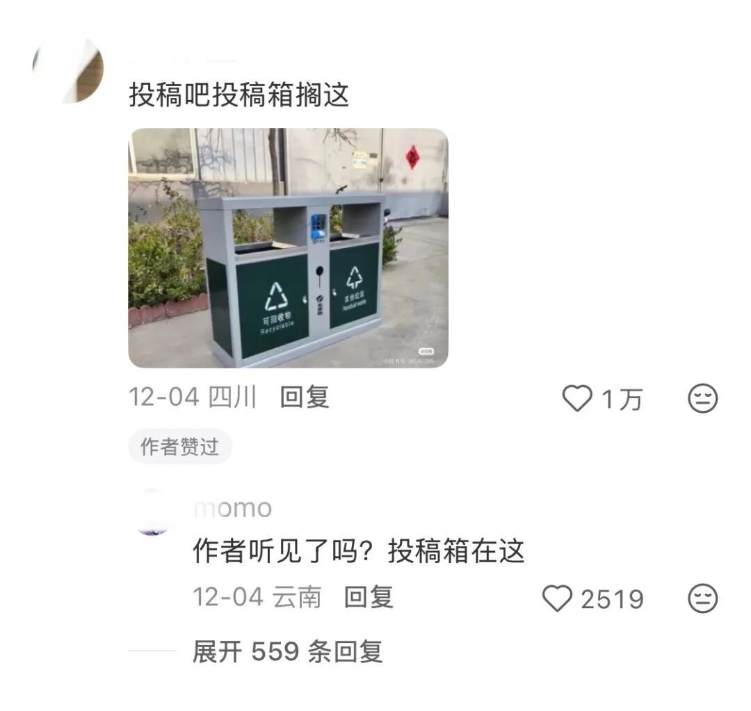 这篇帖子有2.4万点赞,帖子下面的高赞评论有“投稿吧,投到这儿”,然后配一张垃圾桶的图,引来一众“哈哈哈哈哈哈哈哈……”