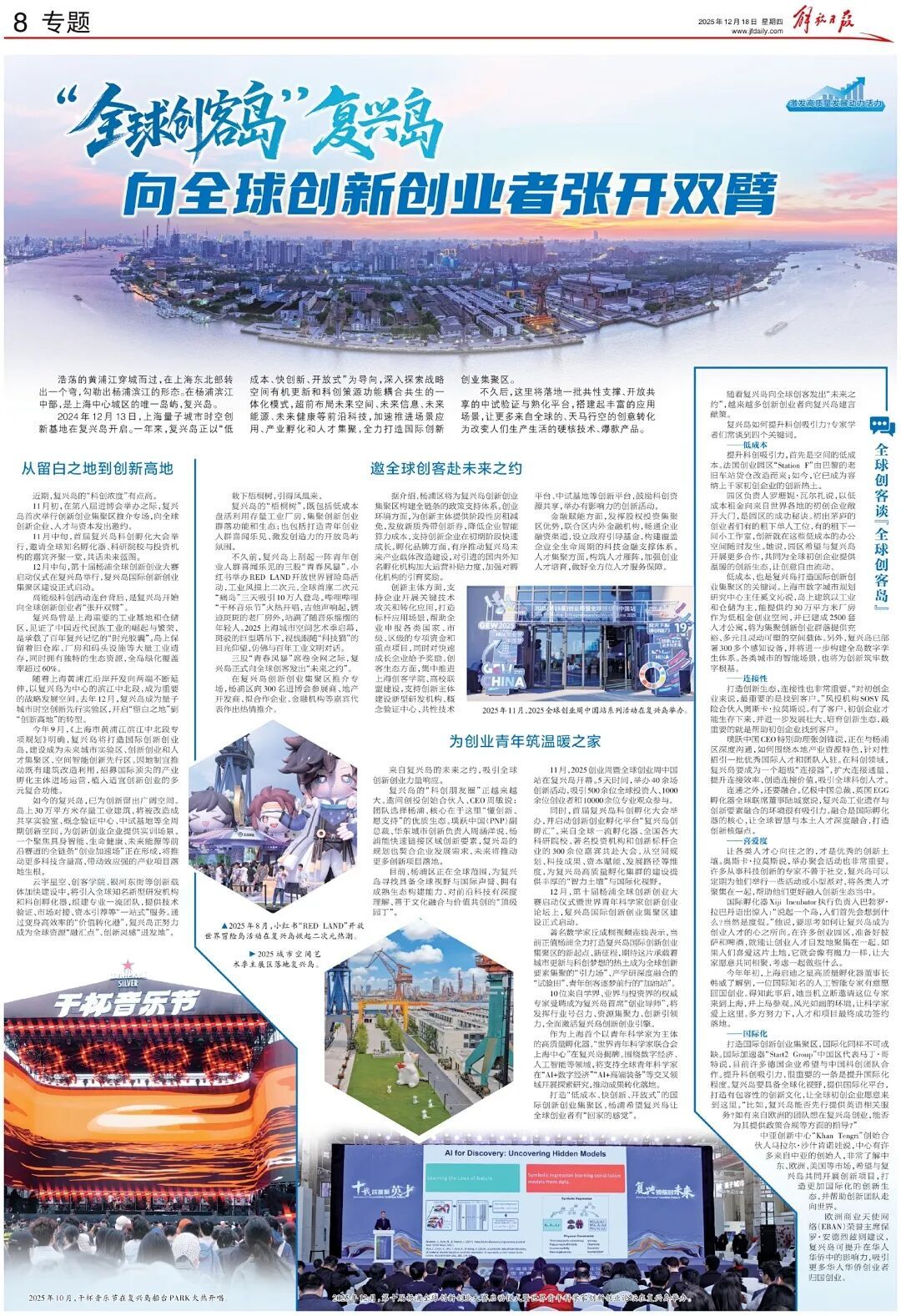 12月18日,《解放日报》专题刊文《“全球创客岛”复兴岛 向全球创新创业者张开双臂》,聚焦上海量子城市时空创新基地在复兴岛开启一年来,从留白之地转型为创新高地。复兴岛深入探索战略空间有机更新和科创策源功能耦合共生,超前布局前沿科技,加速推进场景应用、产业孵化和人才集聚,全力打造国际创新创业集聚区。