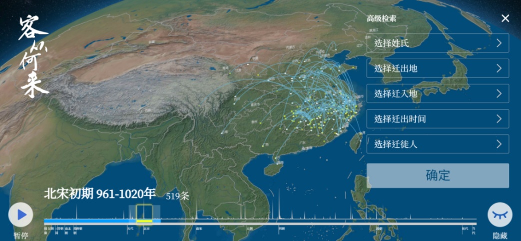 “中国家谱知识服务平台”是一个面向全球多家收藏机构、团体和个人的华人家谱联合目录,可供家谱检索和全文浏览。“客从何来”展项基于“中国家谱知识服务平台”70000余条家谱中记载的迁徙数据,形成可交互体验的动态迁徙图。