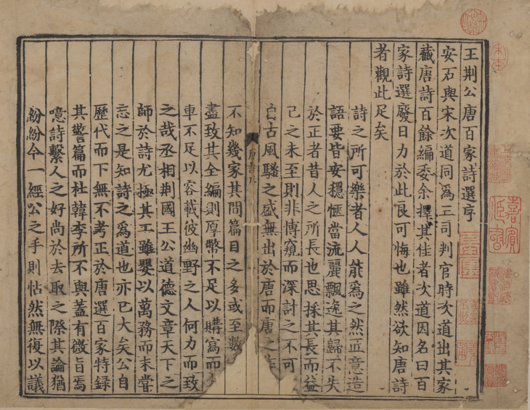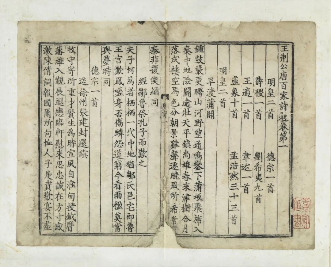 此次展览展出的南宋刻本《王荆公唐百家诗选》是“滂喜斋”所藏宋刻珍宝之一,先后历经黄丕烈、汪士钟、潘祖荫等多位名家递藏。走进展厅,近距离感受古籍流传至今的非凡魅力吧。