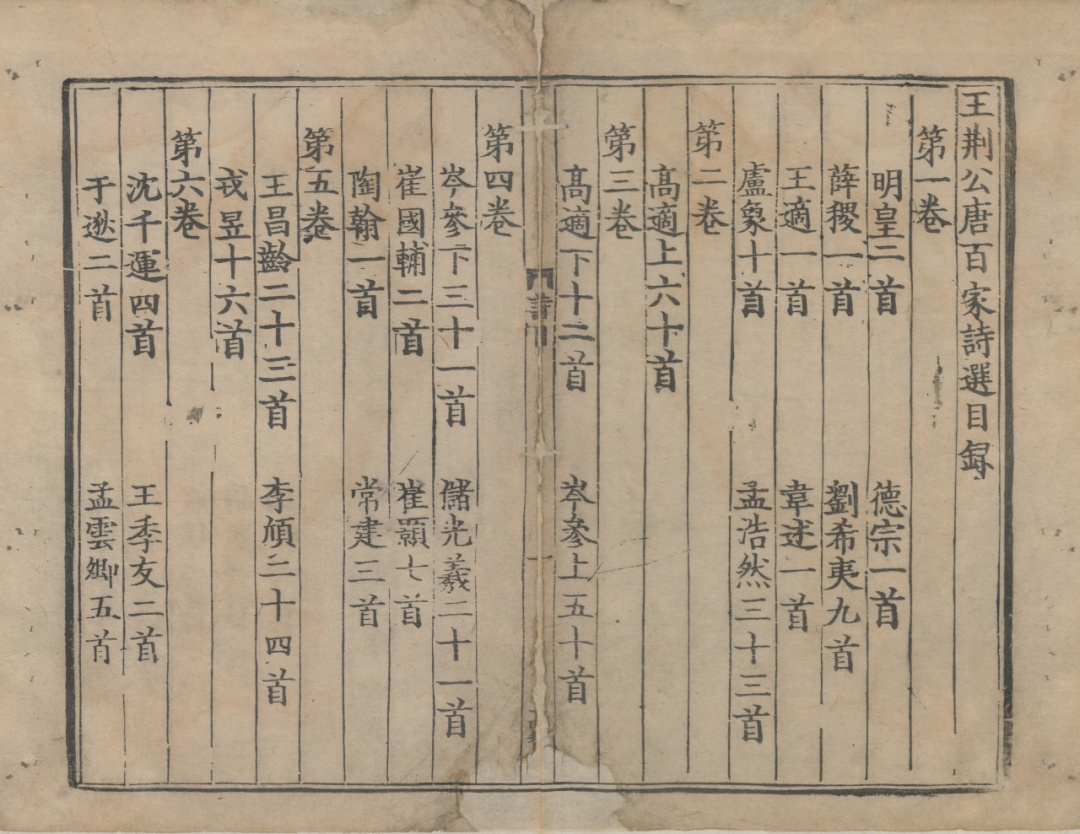 《王荆公唐百家诗选》二十卷内容页,宋刻本,上海图书馆藏