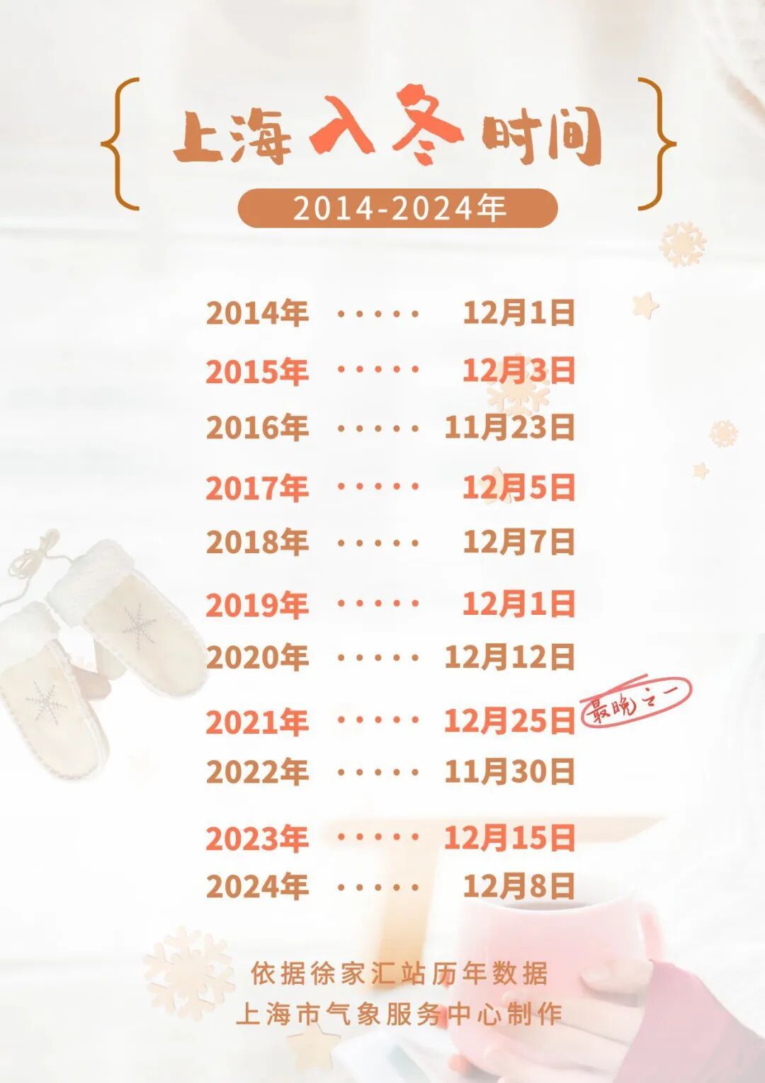 一股冷空气蓄势待发 周末东北到江南多地将上演冷暖大反转 申城亦是如此 周六白天还暖意融融 最高气温仍可达20℃ 夜里起受冷空气影响 气温开始下降 并伴有弱降水和大风过程 周日偏北风增大至5级阵风有6~7级 气温全天被压制在10℃以内 体感变得阴冷 周日夜里起雨止转阴到多云 此轮冷空气影响过后 下周初还将有一次回暖的过程 预计下周二最高气温仍可达18℃ 下周三前后新一股冷空气将再度打乱升温节奏 气温再次进入下降通道 申城开启入冬冲刺 上海常年(1991年~2020年) 平均入冬时间为12月5日 今年至今还没跨进气象意义上的冬天 已经明显偏晚