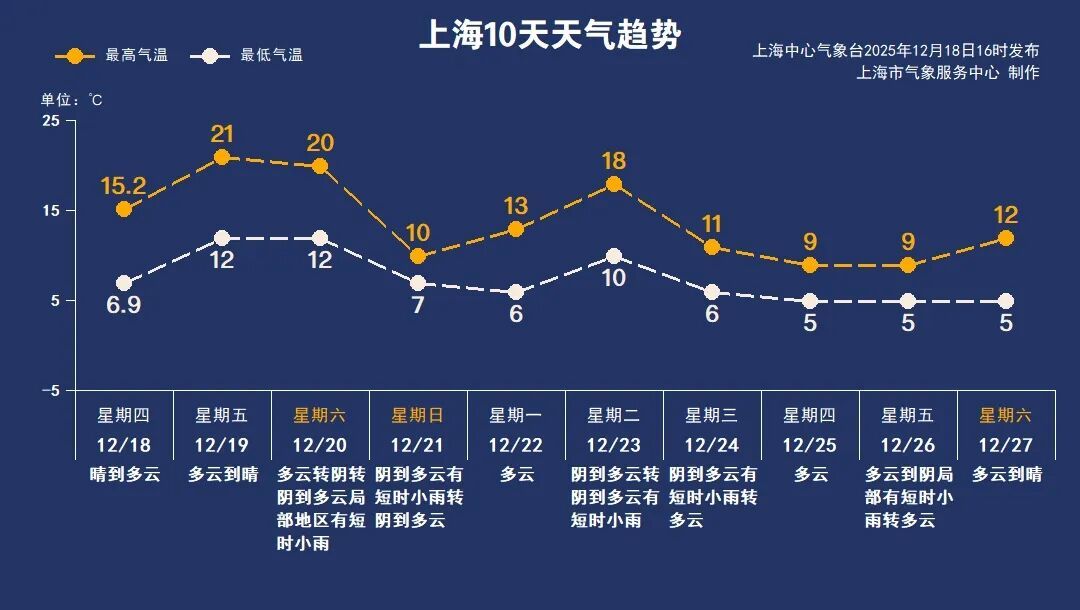 上海气温上演“极限过山车” 明天直接冲上21℃ 周六白天还能享受20℃的温暖 夜里受冷空气影响气温断崖式下跌 周日全天被压制在10℃以内 下周初短暂回暖后又有新的冷空气 今年入冬进度条已明显延迟 上海何时才能入冬?