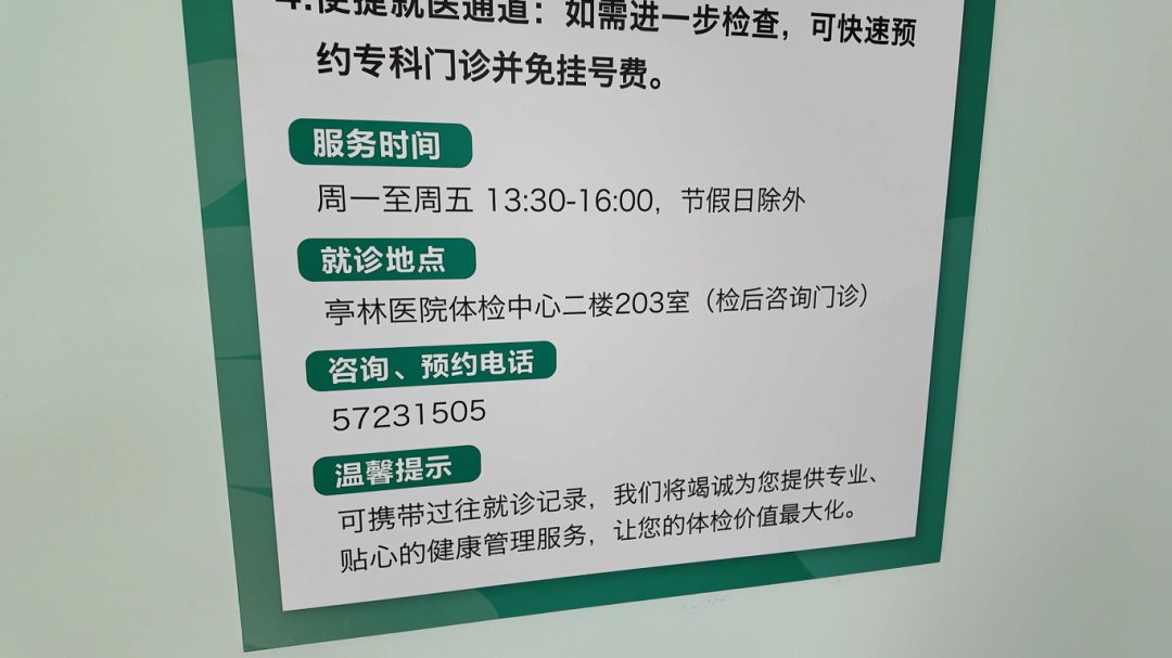 就诊地点:亭林医院体检中心二楼203室(检后咨询门诊)