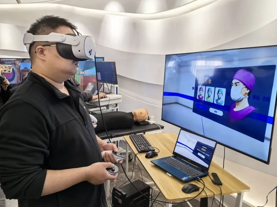 在空岛科技展区,企业员工戴着VR头显、操控手柄进行虚拟手术的演示引人注目。“我们专注于医学专科临床模拟和人工智能临床应用,这些是我们研发的医疗元宇宙产品。”空岛科技创始人兼首席执行官闵世豪介绍,公司针对心血管、脑血管、电生理、腹腔镜、麻醉和超声等专科领域进行系统化研发,产品已进入国内100多家医院和医学院校,用于低年资医生和医学生培训,实训总时长超11万小时。在参与真实的手术前,他们可通过这种元宇宙系统,学习手术全过程的各个步骤,进行虚拟操作训练。为了提供真实体验,这家上海企业给元宇宙系统安装了力反馈模块,让用户在虚拟操作过程中,能感受到血管壁阻力等各种力觉效果。