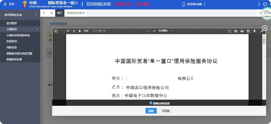 完成此步骤后请将上方页面截图发送至信保专员企业微信,发送后待信保专员通知(预计1-1.5小时)再操作“2 签署赔款转让协议”。