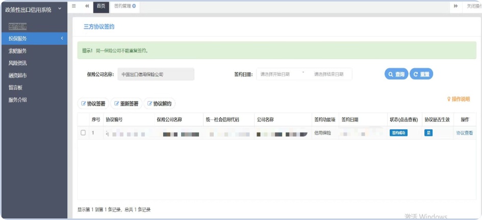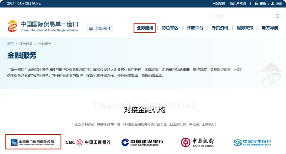 访问中国国际贸易单一窗口(网址:www.singlewindow.cn)首页,选择“业务应用”—“金融服务”,在下方对接金融清单中选择“中国出口信用保险公司”图标。