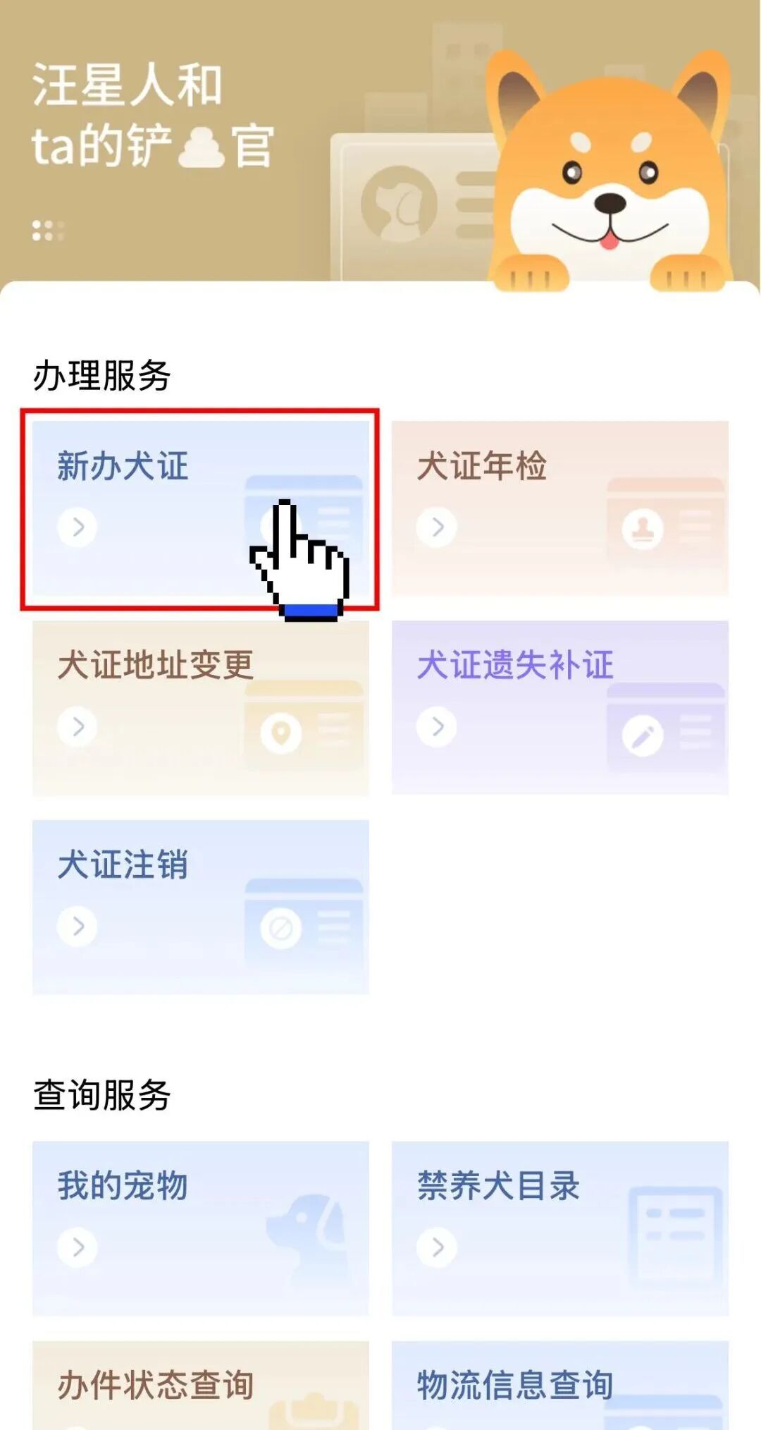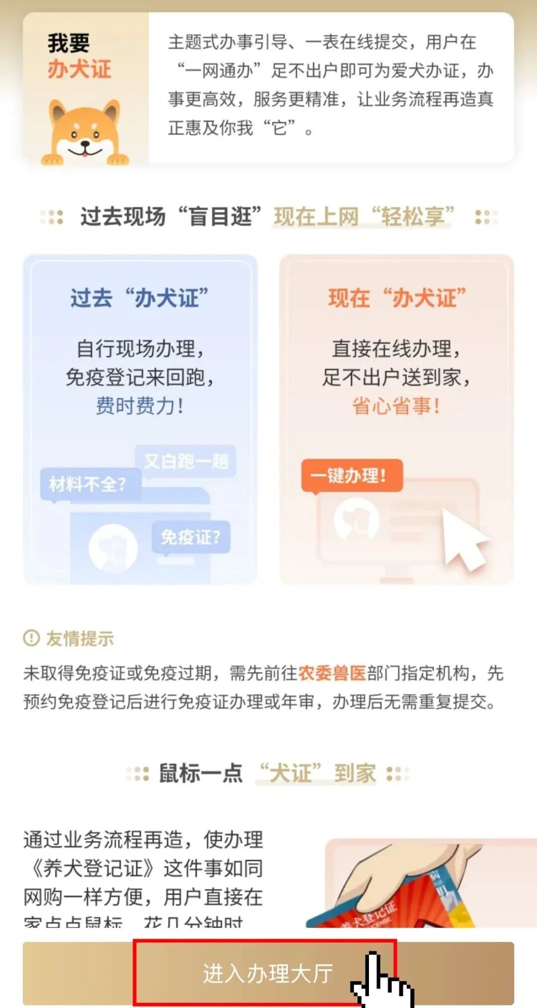 在“文明养犬一件事”专栏,点击进入“办事大厅”,选择办理服务“新办犬证”。