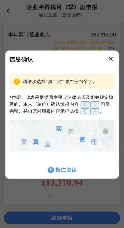 系统弹出信息确认的验证界面。在输入框依次输入或语音说出“真”、“实”、“责”、“任”4个字,完成验证提交申报,也可点击右上角“x”再次确认申报信息。