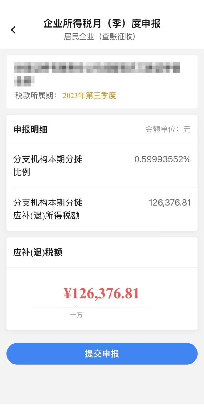 纳税人只需确认分支机构本期分摊比例和分支机构本期分摊应补(退)所得税额。两项数据根据总机构同属期申报的《企业所得税汇总纳税分支机构所得税分配表》带出,不可修改。纳税人确认数据带出是否正确,无误则点击“提交申报”。如下图: