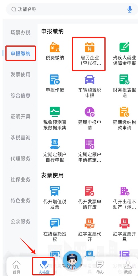 1.登录电子税务局App后,点击【办&查】 -【申报缴纳】- 【居民企业(查账征收)企业所得税月(季)度申报】功能菜单。