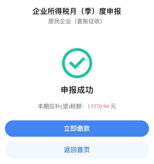 5.完成验证,跳转申报回执页面,系统提示申报成功。纳税人可点击“立即缴款”按钮跳转税费缴纳界面。如下图: