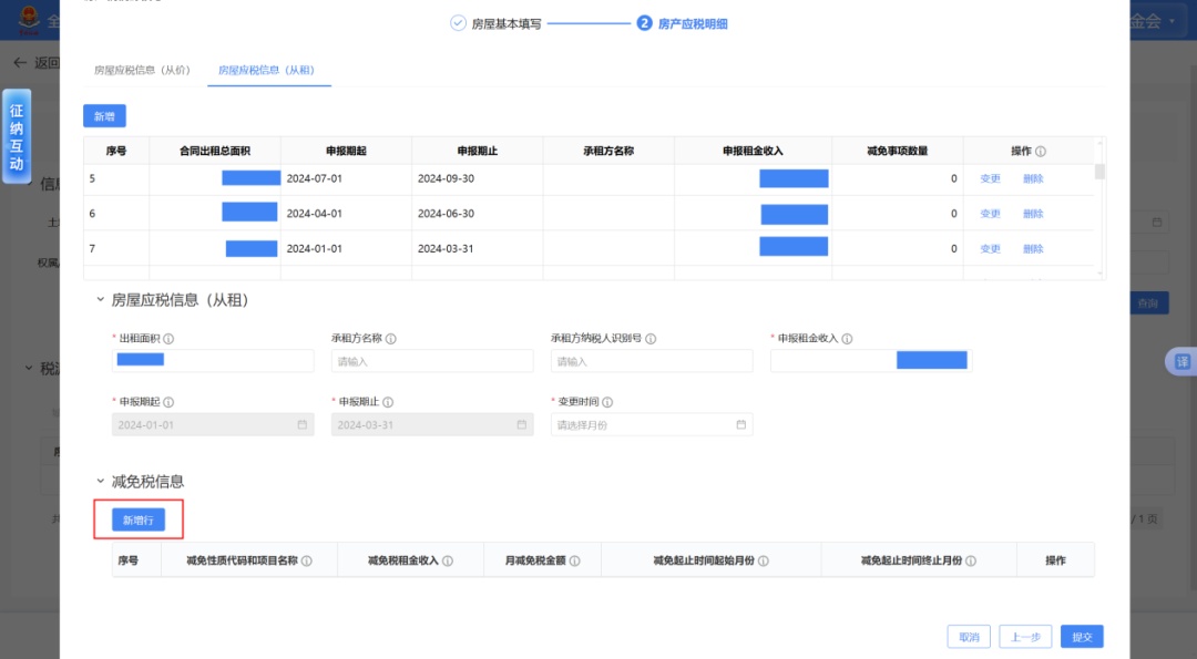 点击“变更”后页面下方会自动带出该期间应税信息详情。点击“减免税信息”下的“新增行”,即可新增一条空白行次。