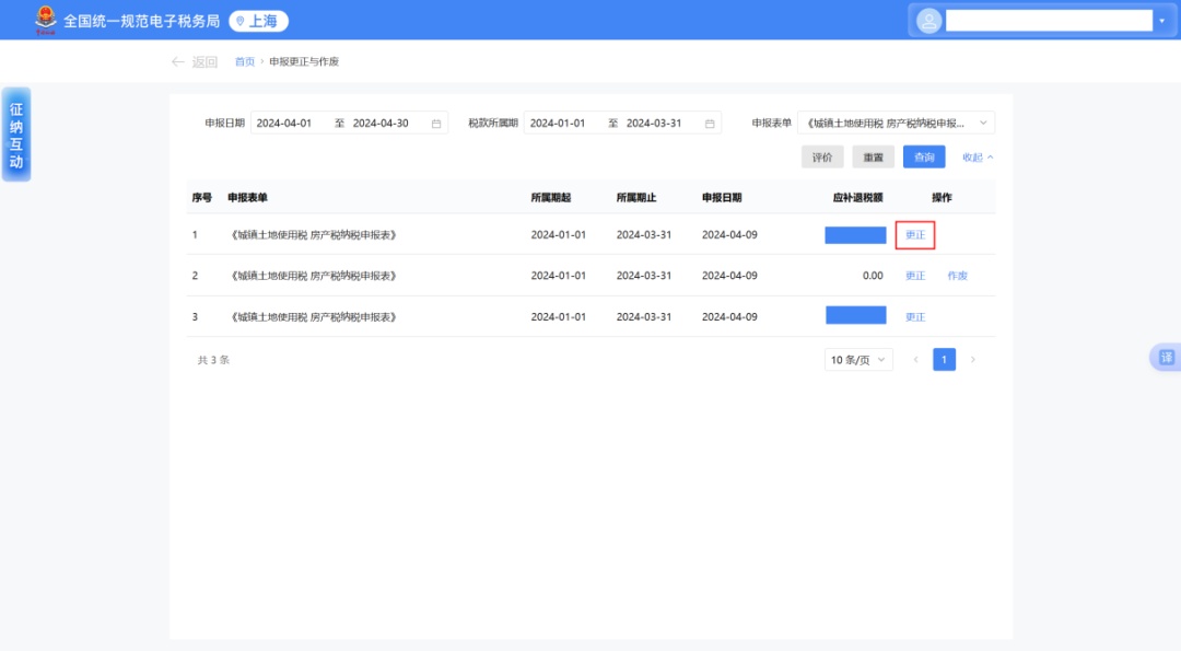 2.选择需更正属期的申报数据