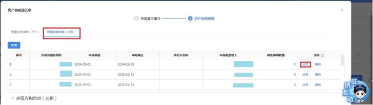 进入“房屋应税信息(从租)”页面,点击包含需要维护减免税信息期间的房产应税信息后方的“变更”。