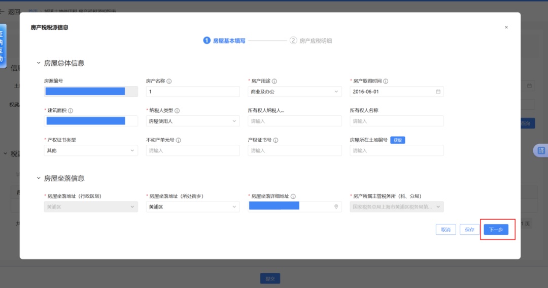 首先弹出的是“房产基本填写”,通常无需修改,直接点击“下一步”。
