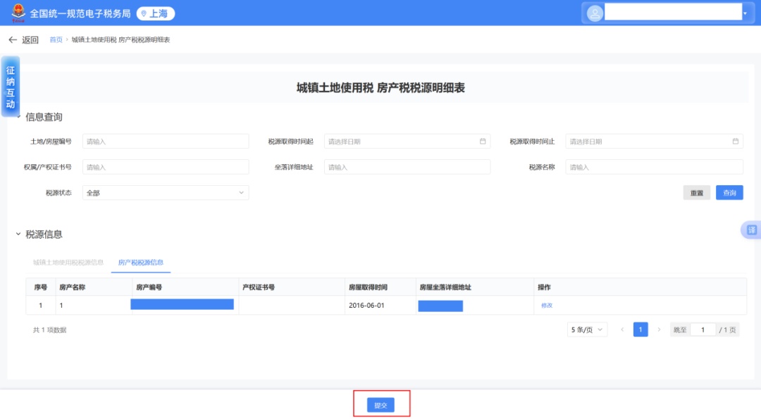 点击需修改应税信息的房产后方的“修改”按钮进行该条房产的税源维护。