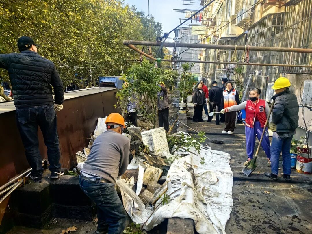 群众的困难就是他们的责任,居民区党总支、居委会第一时间介入,主动联系相关住户,耐心细致地做好思想沟通工作,讲清积水隐患的危害和维修的紧迫性。同时,积极联动街区书记、城管部门统筹协调,协调吊车等设备协助搬移平台堆物。