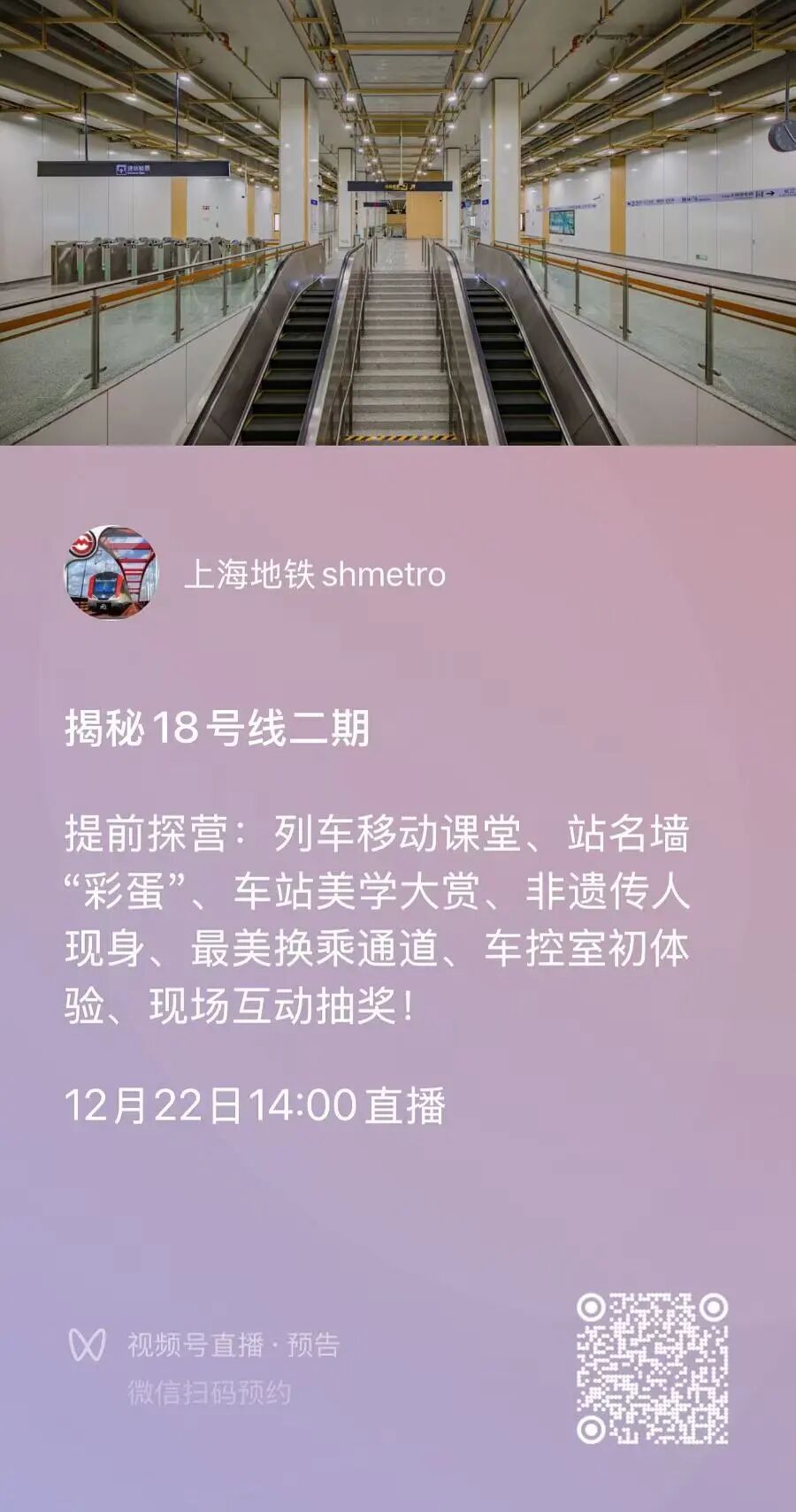 1 直播预告 2025年12月22日(周一)下午2点,小编将带您深入上海地铁18号线二期建设现场,通过官方微视频,开启一场融合传统匠心与现代科技的沉浸式探访直播! 核心亮点抢先知: 列车移动课堂 地铁建设人员首次公开揭秘盾构中的“榫卯结构”,讲述古老智慧如何融入当代隧道工程,科技与传承在此交汇。 站名墙上的“隐形彩蛋” 留心观察站内浮雕,每一处纹路都暗藏故事,等你现场解码。 车站美学深度解读 工艺美术大师深度解读车站设计,揭开功能与装饰融合背后的创作故事。 换乘通道抢先走 提前了解车站布局与换乘客流组织,最美通道便捷换乘走行。 车控室开放体验 走进地铁车站“大脑”,近距离了解车站运营与设备操作。 非遗大师“彩蛋”现身 淞南“蛋雕”传承人亲临现场展示技艺,讲述非遗文化与城市轨道交通的不解之缘。 现场互动抽奖 列车行进途中,直播间将随机抽取幸运观众,送出限量地铁文创及惊喜好礼! 微信扫码预约 直播时间:2025年12月22日14:00 直播地点:上海地铁18号线二期 观看平台:上海地铁shmetro微信视频号 这一次,我们不只带你“看新线”,更带你“读懂新线”。 锁定直播,一起“铁丝”云探营、看现场、聊设计、抽好礼,见证城市新动脉的诞生! (活动流程以现场实际为准)