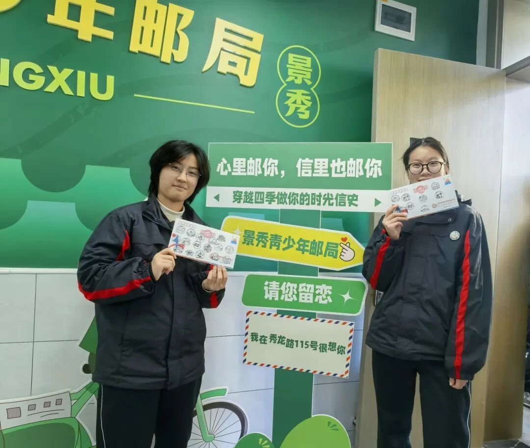 景秀高级中学的一间教室,已经打造成了一家小型邮局——门口卡通造型的邮筒宝宝已经上岗,里面陈列柜里有毛绒玩具、冰箱贴等文创产品,书写区里不少同学正排队撰写信封,还有同学在盖章台边把一个个纪念章印在纪念封上。