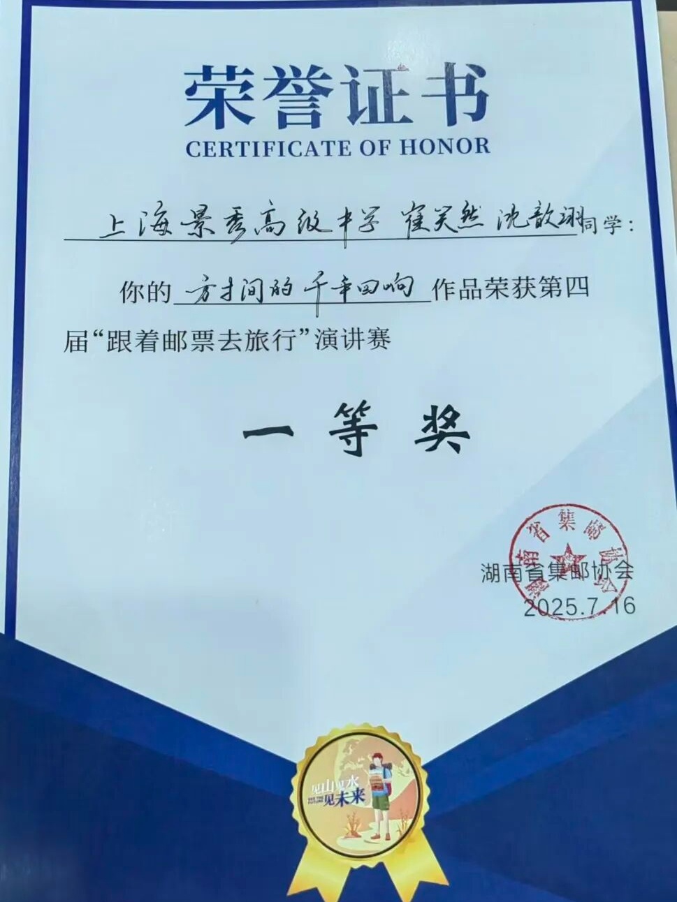 景秀高级中学2023年获评上海市集邮特色学校、高中集邮基地校,学校党支部副书记诸丹萍表示,15年间,邮票早已从兴趣载体,成长为学校践行“四品八德”、传递育人温度的桥梁。