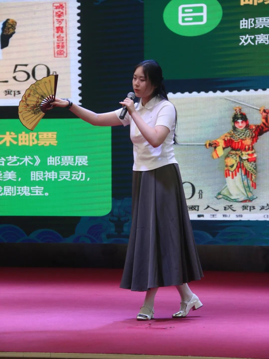 学校的一系列课程和活动,也让对于“00后”来说更像“老古董”的邮票“活”了起来。学生崔笑然说,入学后自己在社团招新中被“调剂”到了集邮社,本来只想“摸鱼”,“小时候我在爷爷家里看到过《京剧脸谱》邮票,并没有在意。社团的第一节课,老师拿出一枚昆曲邮票——那是2008年发行的《牡丹亭》‘游园惊梦’,杜丽娘一袭白衣,眉眼含情,仿佛从水墨丹青里走出来。老师说,这枚邮票背后,是‘水磨调’的婉转,是中国人最动人的爱情叙事。那一刻,我忽然被击中了。原来这小小的纸片里,藏着这么细腻的文化密码。后来我又参加了学校的‘跟着邮票去旅行’研学活动,慢慢也读懂了爷爷当年的热爱”。
