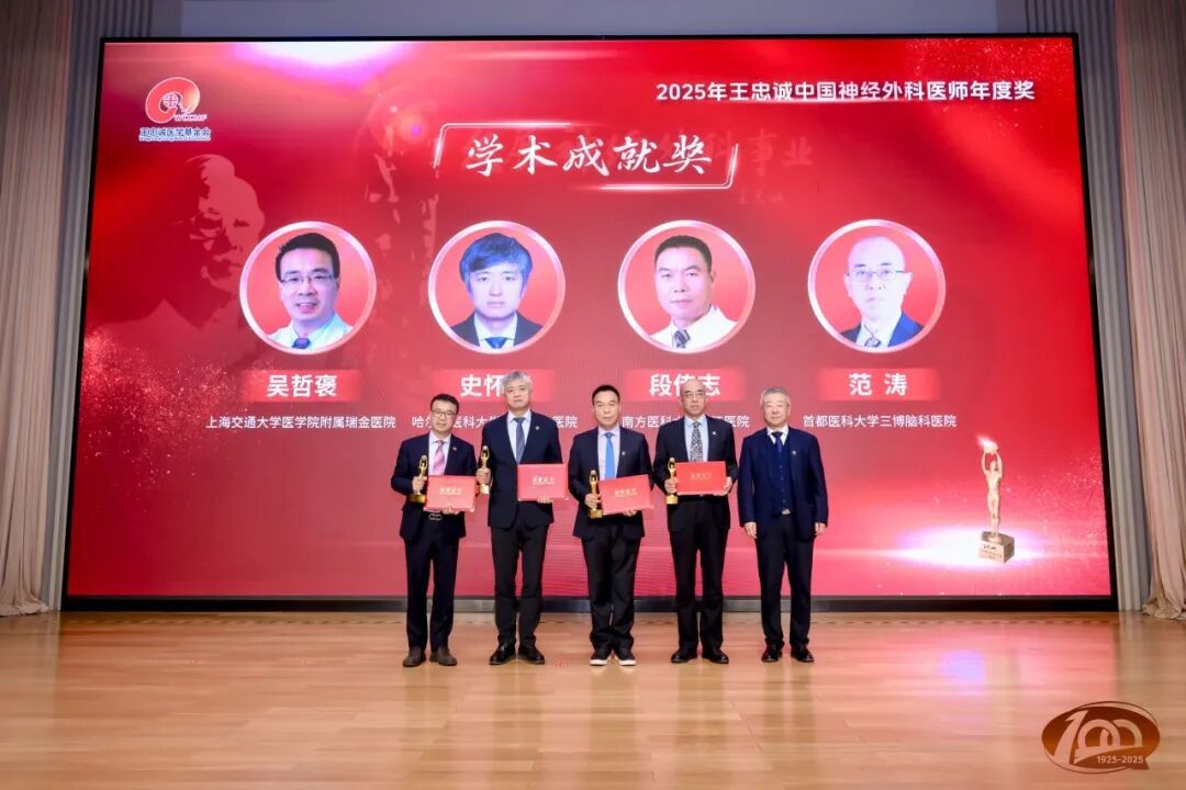 据悉,"王忠诚中国神经外科医师学术成就奖"由中国医师协会神经外科分会和北京市王忠诚医学基金会于2005年共同创立,以中国神经外科事业奠基人王忠诚院士命名,今年,正值“王忠诚院士诞辰100周年“。该奖项是中国神经外科领域最高级别的个人荣誉奖,旨在表彰对中国神经外科领域作出突出贡献的专家。