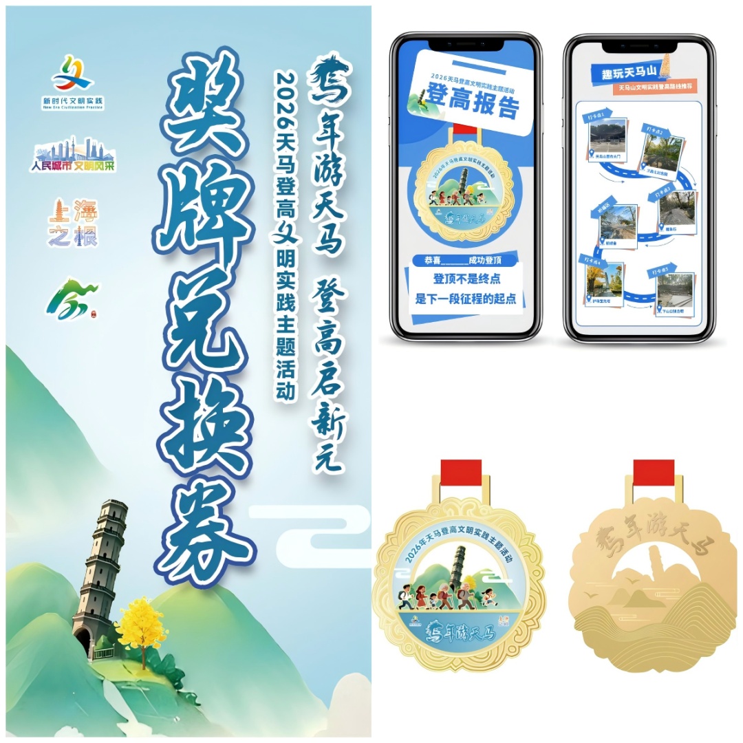 路线沿途设置东大门广场、三高士纪念园、鲤鱼石、护珠宝光塔和下山口骑龙堰5个文明主题打卡点,成功报名的家庭根据装备包内的奖牌兑换券收集到路线对应印章后,即可兑换定制马年主题登山纪念奖牌,使用NFC手环“碰一碰”功能,领取你的专属电子登山报告。